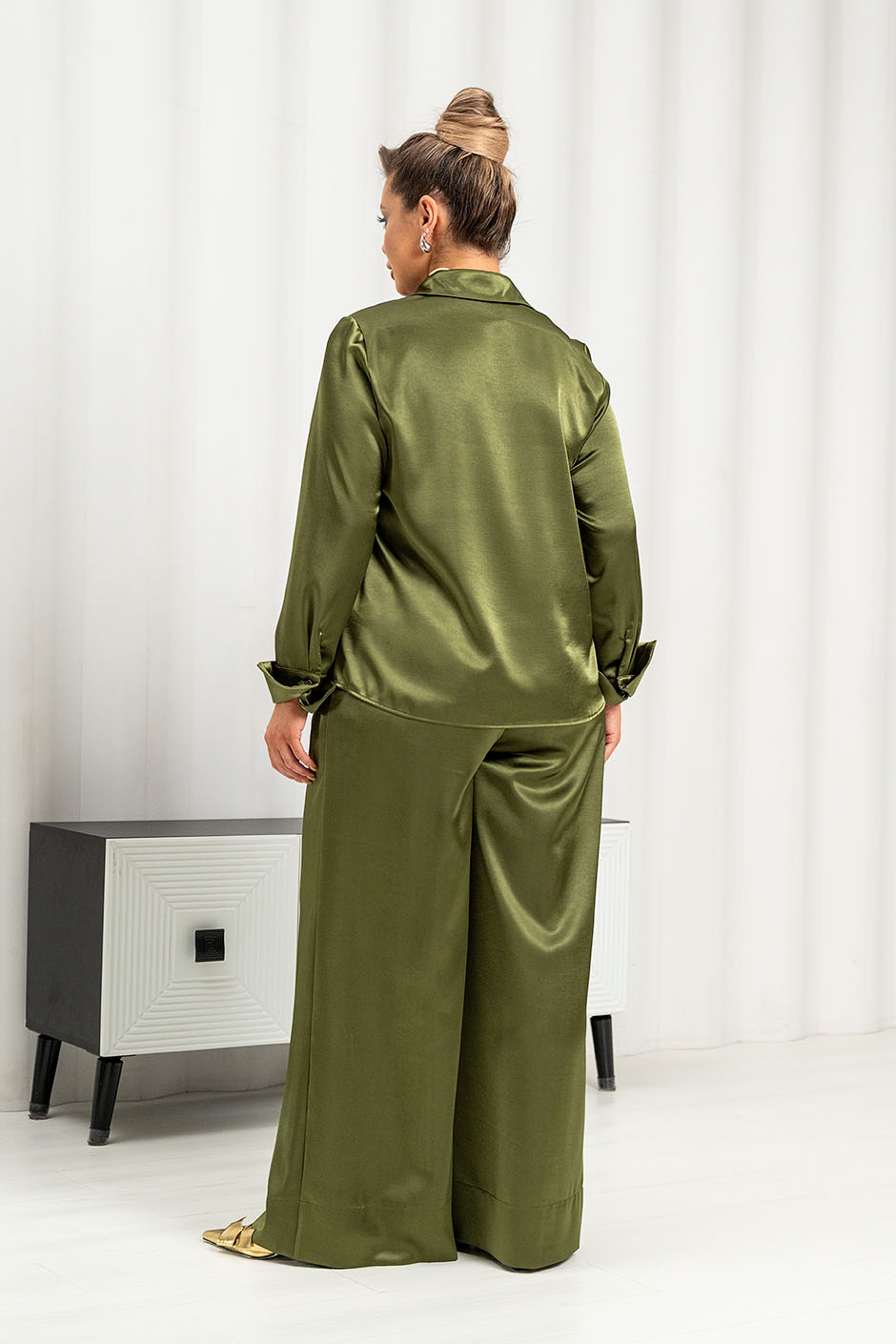 Ткань: шелк-сатин. Рубашка прямого покроя, рукав втачной, воротник на стойке, спереди застежка. Рукав длинный с манжетом на одну пуговицу с декоративным отворотом. Длина изд. ок.65 см.