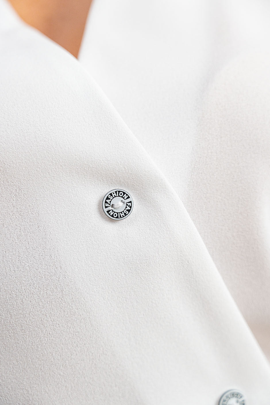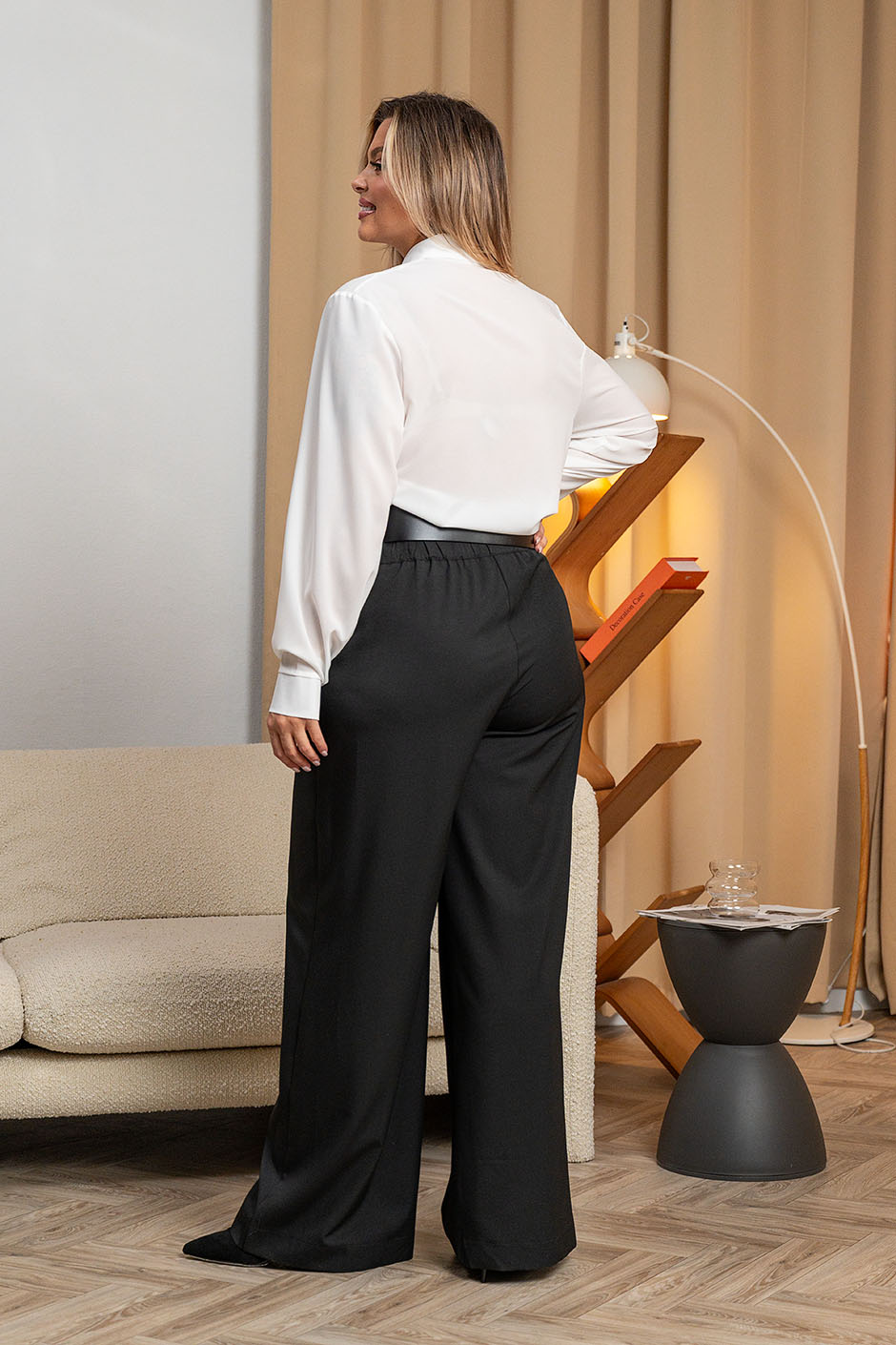 Ткань: креп однотонный. Блузка прямого покроя, спереди имитация запаха, воротник на стойке-чокер. Рукав длинный на манжете. Длина ок. 70 см.