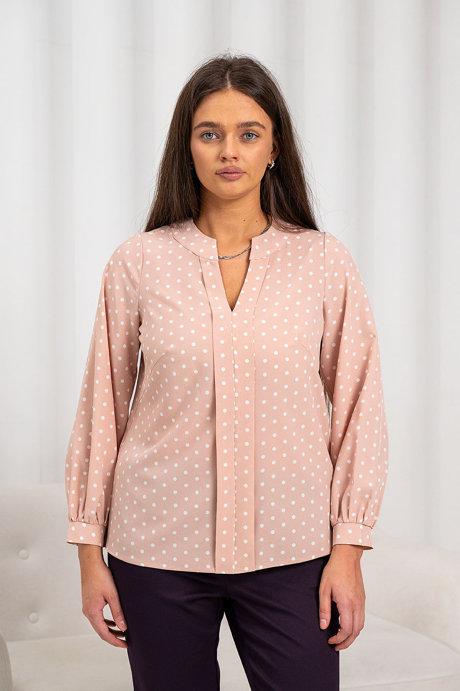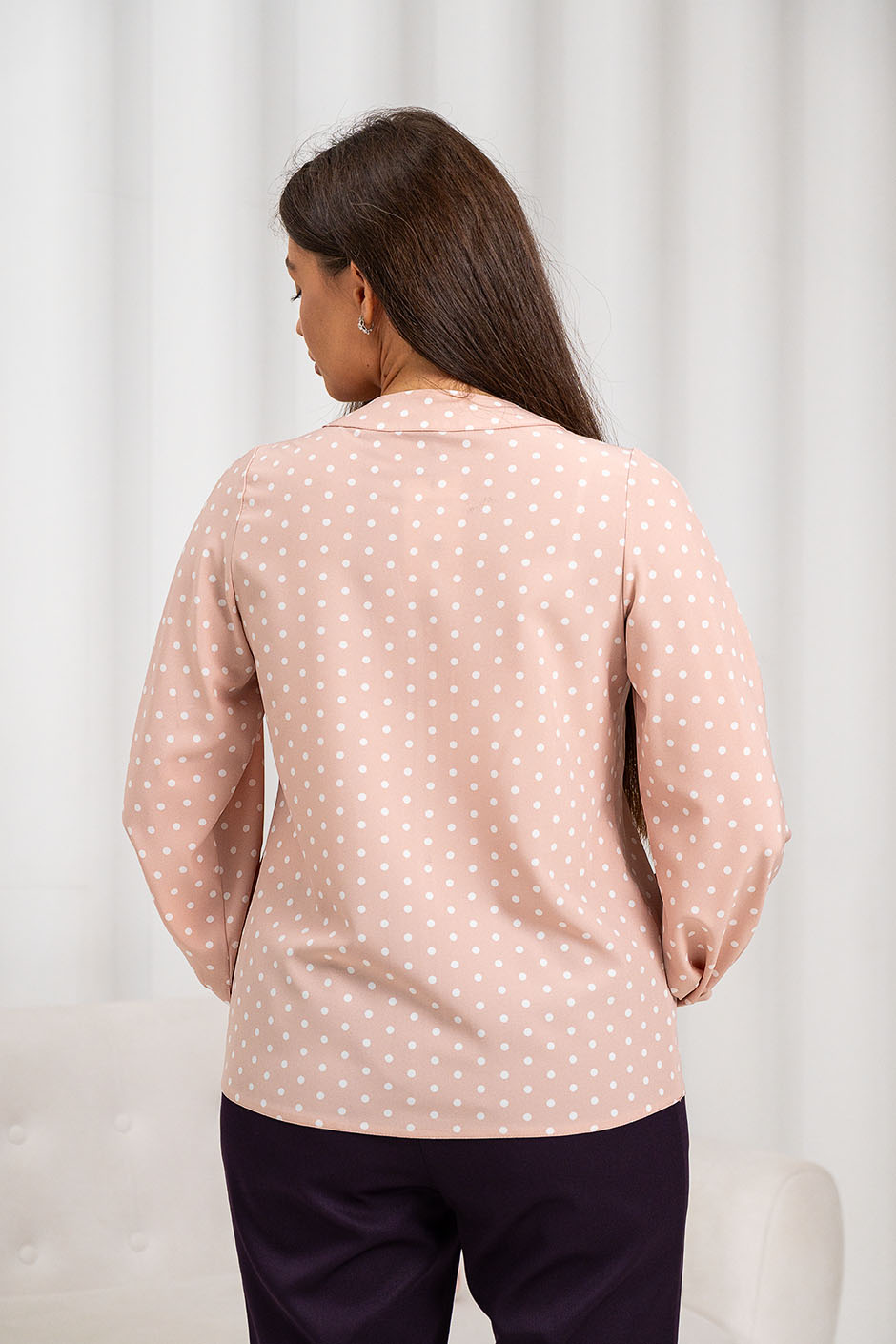Ткань: искусственный шелк. Блузка прямого покроя, спереди бантовая складка, переходящая в лежачую стойку. Рукав втачной, длинный на манжете. Длина изд.ок.65см.