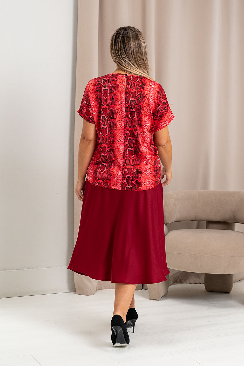 Ткань: искусственный шелк, набивной. Блуза простого свободного покроя, с цельнокроеным  рукавом. Рукав короткий. Длина ок. 60 см.