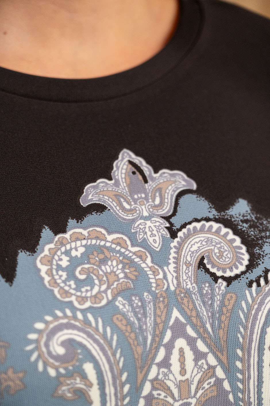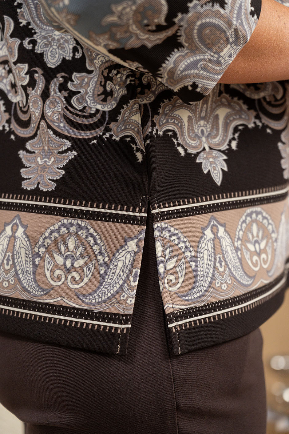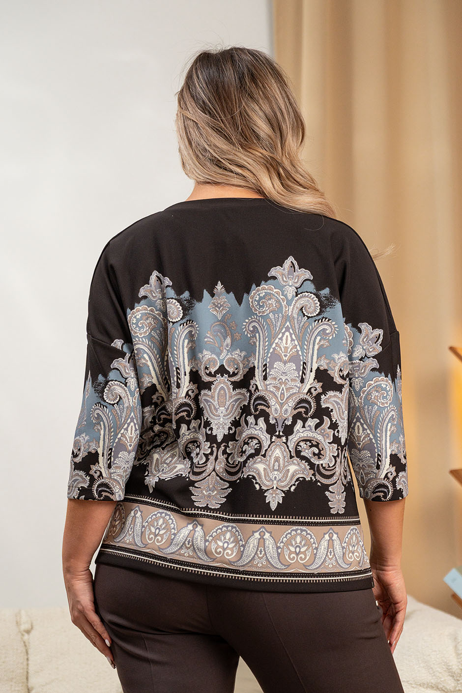 Ткань: трикотажное полотно. ОСНОВНОЙ ФОН ШОКОЛАДНЫЙ. Джемпер свободного покроя, со спущенной линией плеча. Рукав ¾. Длина ок. 63 см.