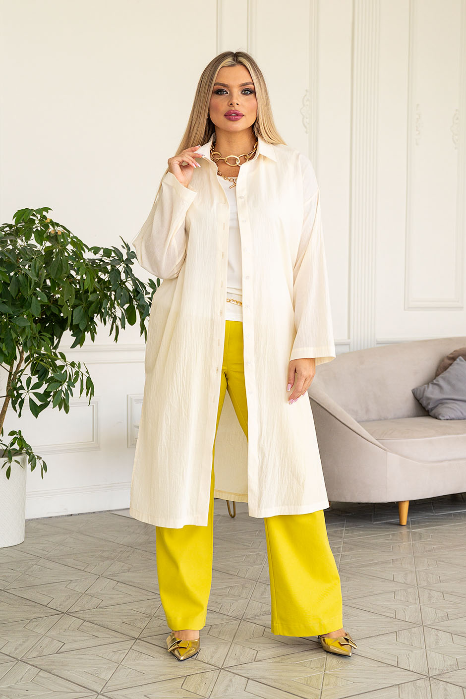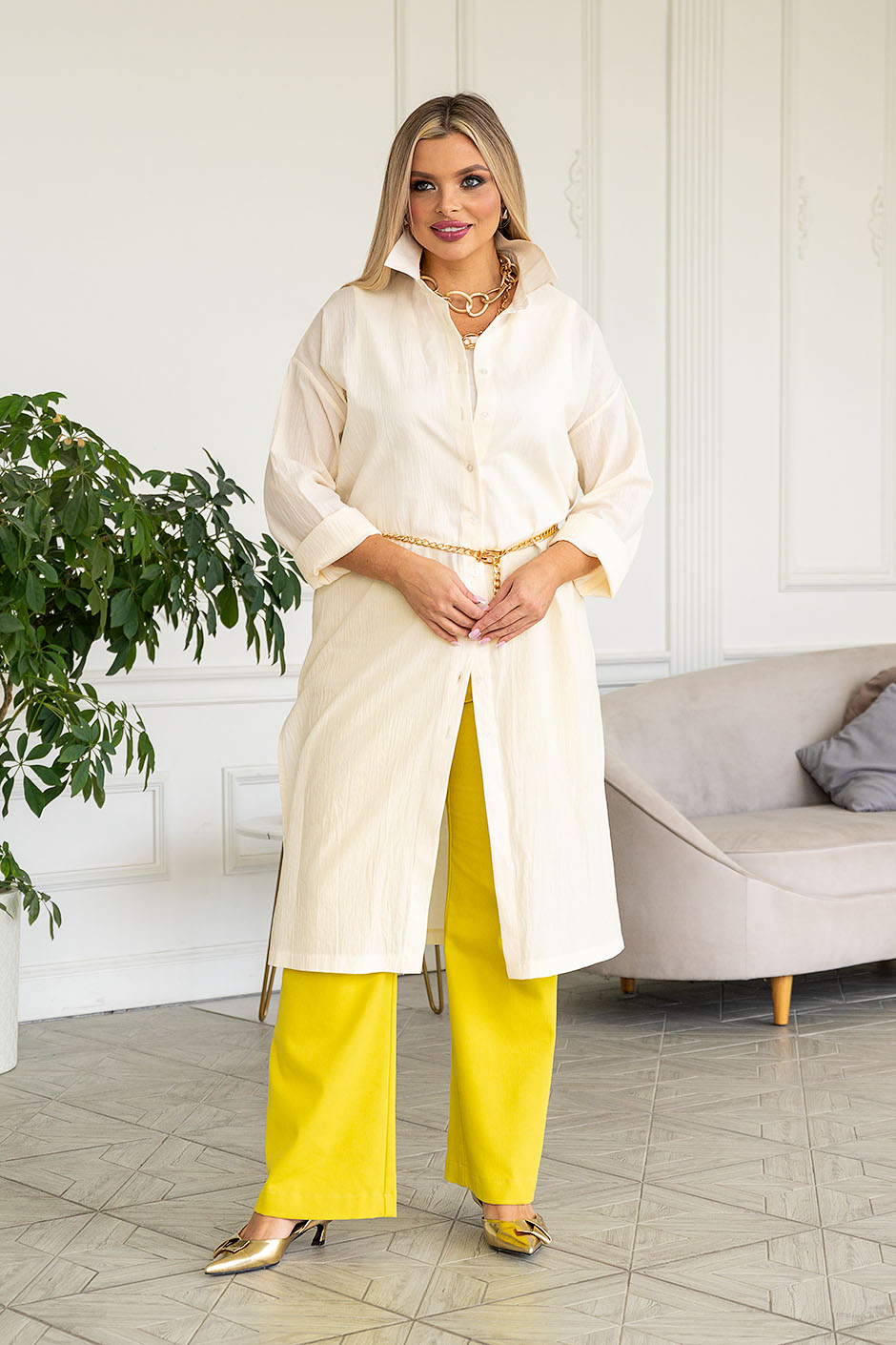 Ткань: хлопок однотонный. Платье-рубашка свободного покроя, пройма немного занижена, воротник на стойке, спереди – застежка на пуговицы, по бокам разрезы.Рукав длинный. Длина ок.113см.