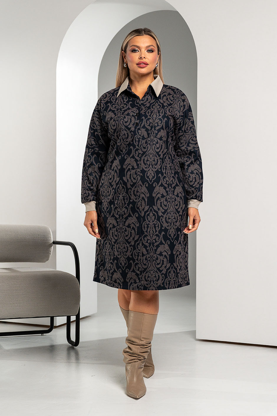 Ткань: трикотажное полотно Джерси, принтованное. Платье свободного , полуприлегающего силуэта, спереди – имитация застежки и воротник из отделочной ткани,в боковых швах - карманы. Рукав длинный на манжете из отделочной ткани. Длина ок.102 см.