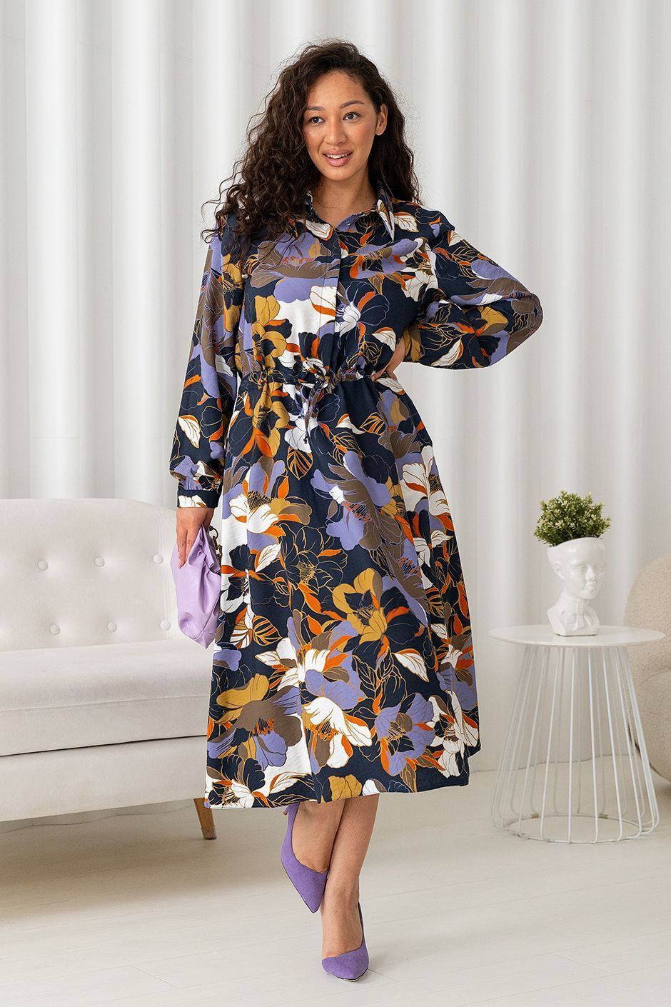 Ткань: хлопок с эффектом креш. Платье-рубашка, на кулиске. Рукав длинный на манжете. Длина изд. ок.127см.