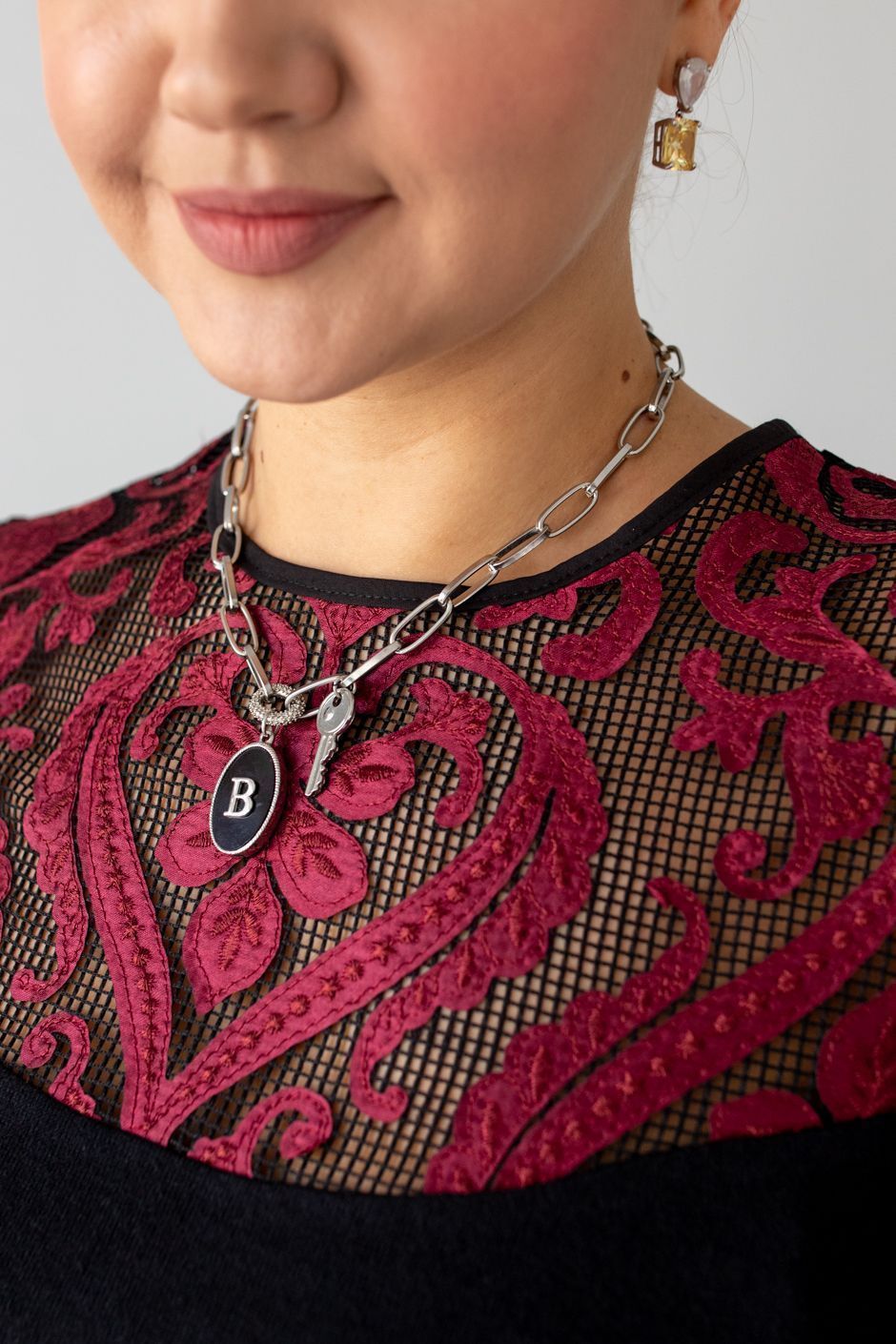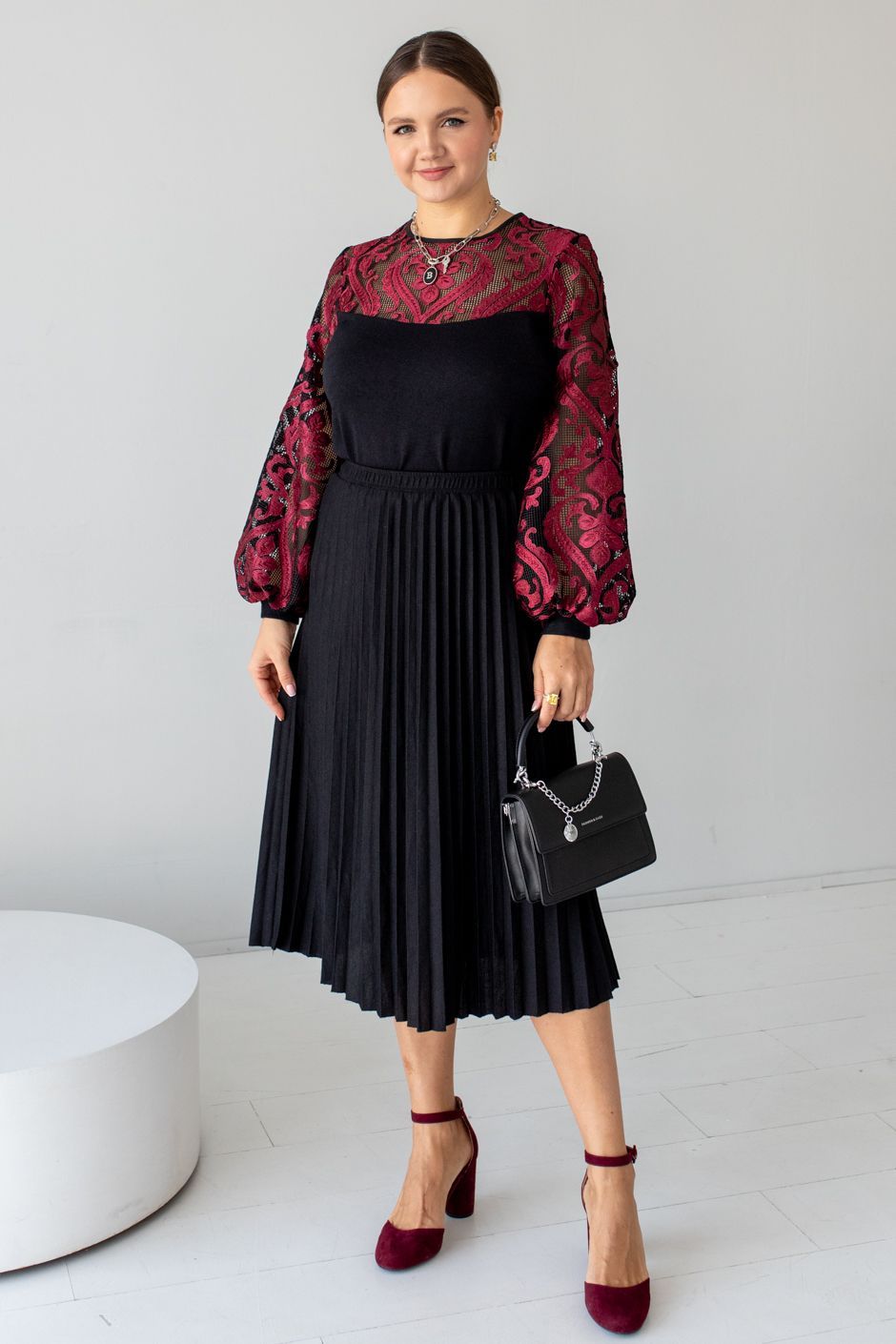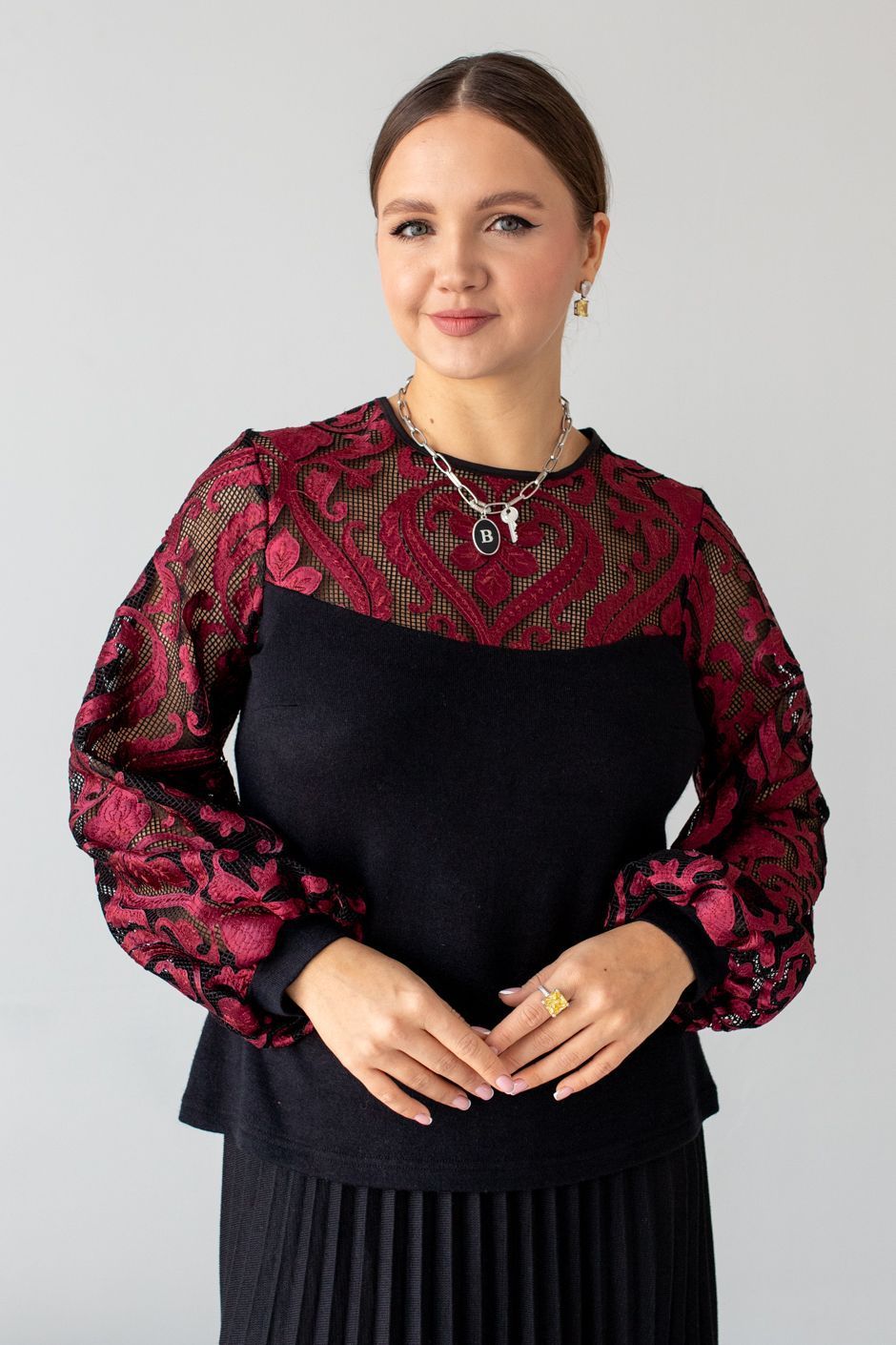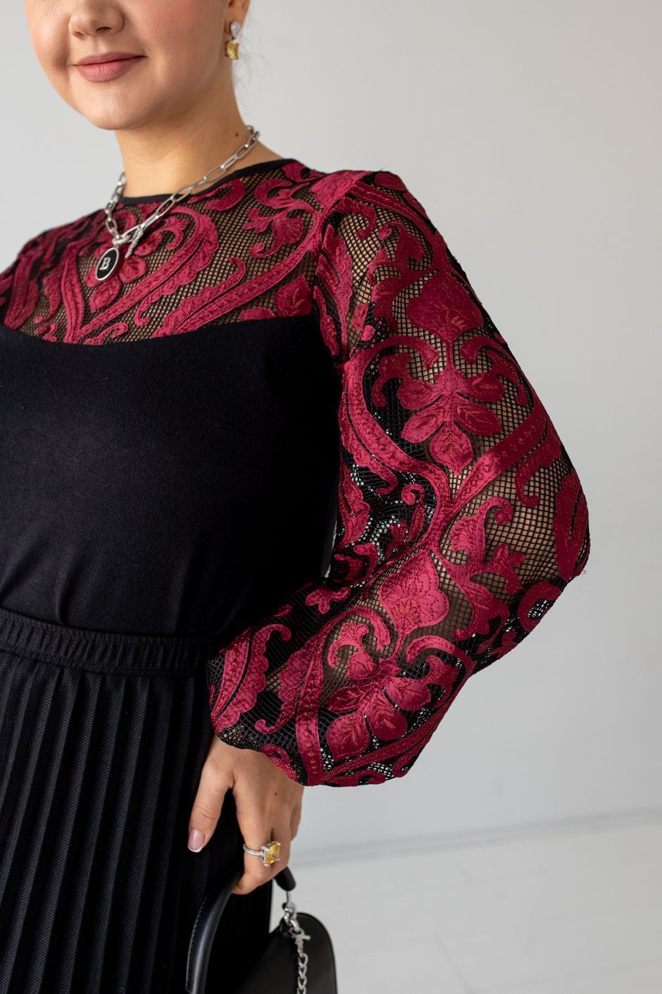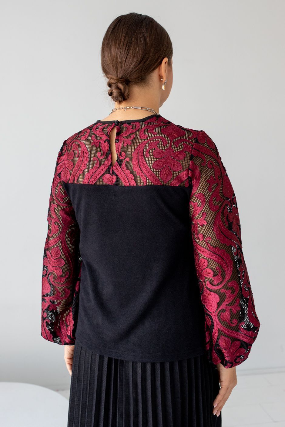 Ткань: трикотажное полотно, комбинированное с сеткой с атласными вензелями. Блуза из тонкого трикотажа, кокетка и рукава из сетки.  Рукав длинный, пышный. Длина ок.65см.