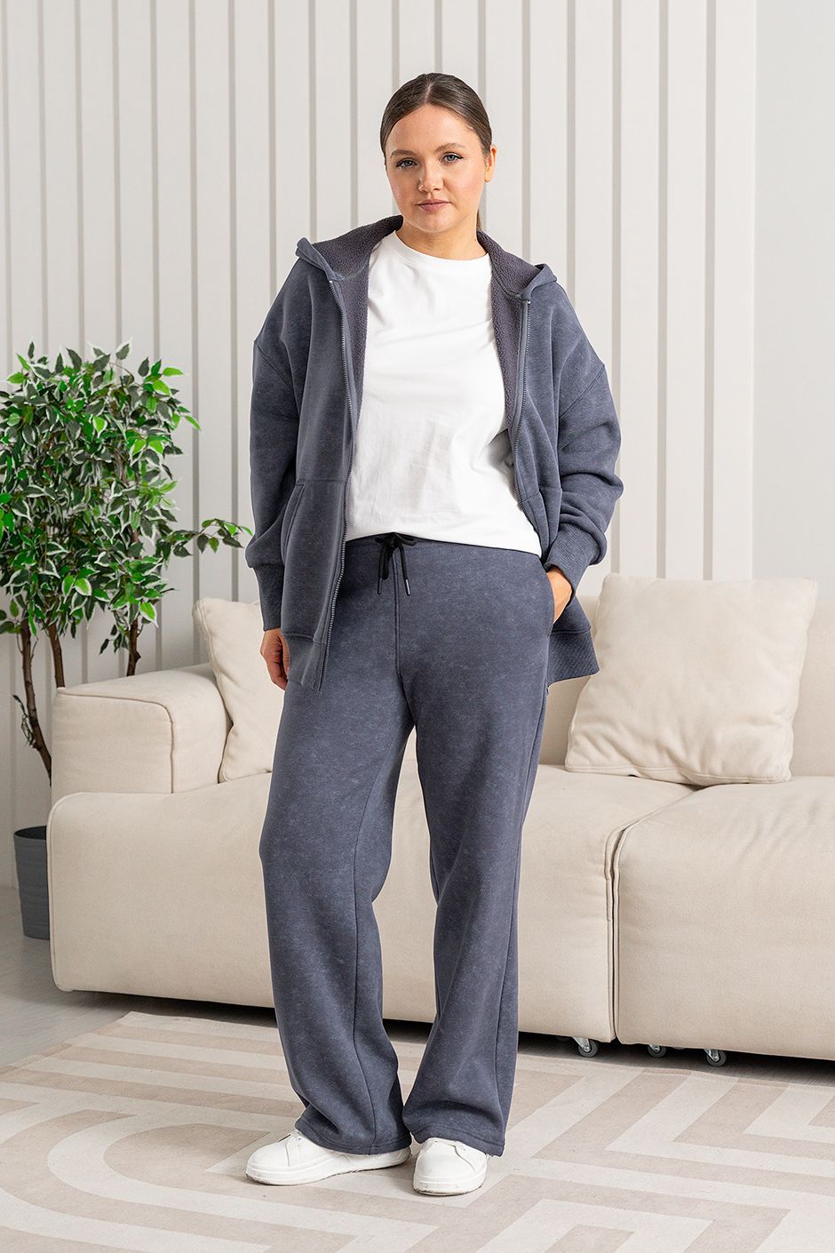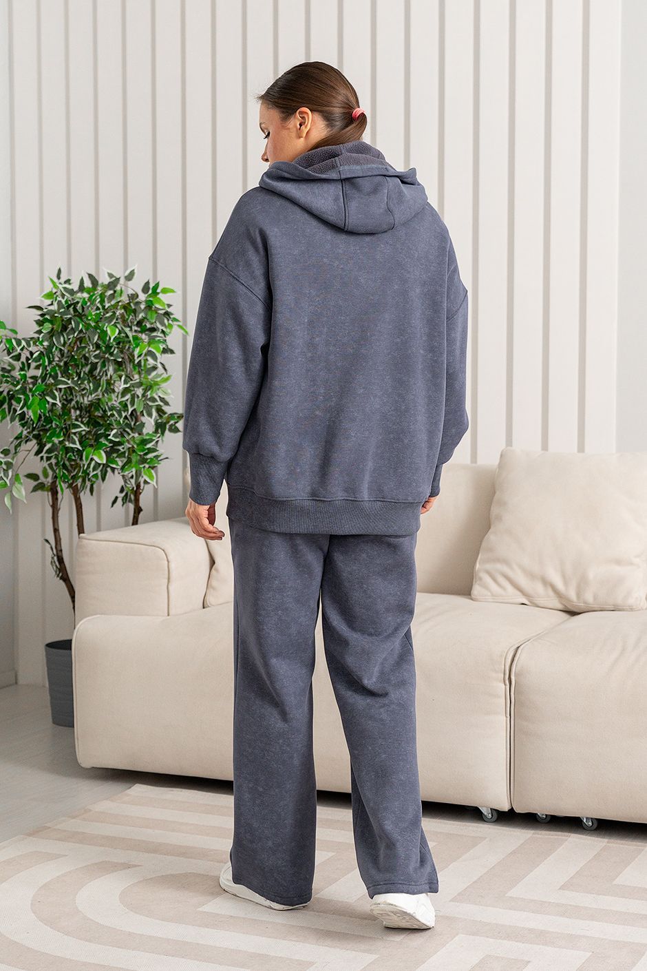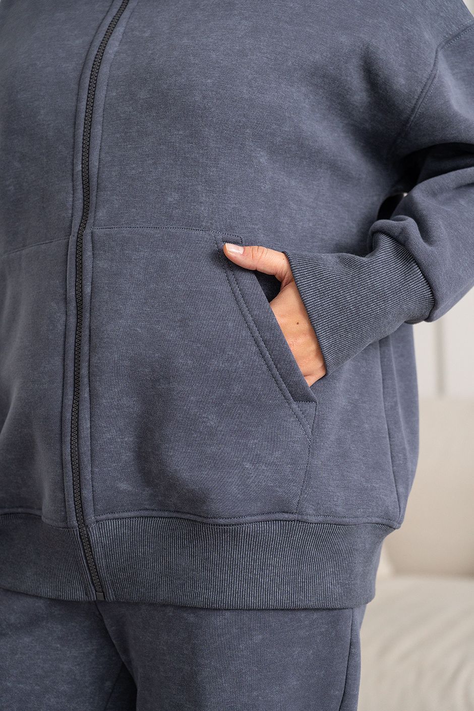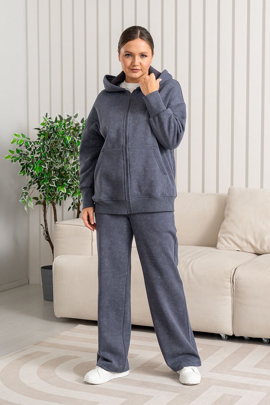 Ткань: Футер интерсофт шарпа(барашек-начес),с эффектом "варенки". Худи с капюшоном, спереди – карман-кенгуру и застежка на молнию. Длина ок 70 см.  Брюки с высокой посадкой прямого покроя, в боковых швах – косые карманы,сзади накладной карман, модная кулиска по низу брюк, длина по внутреннему шву ок.75 см.