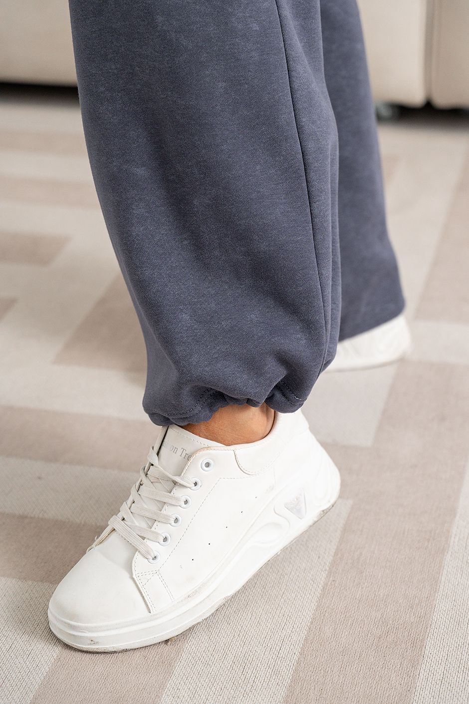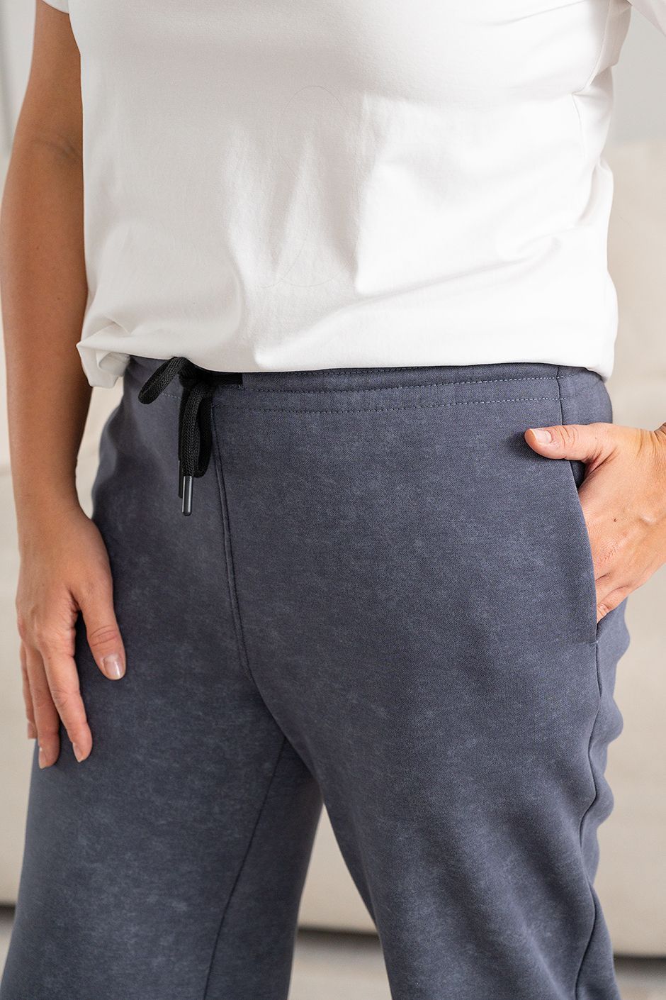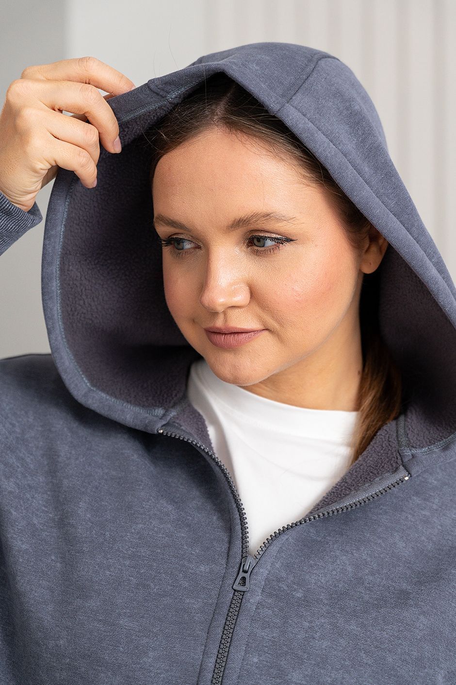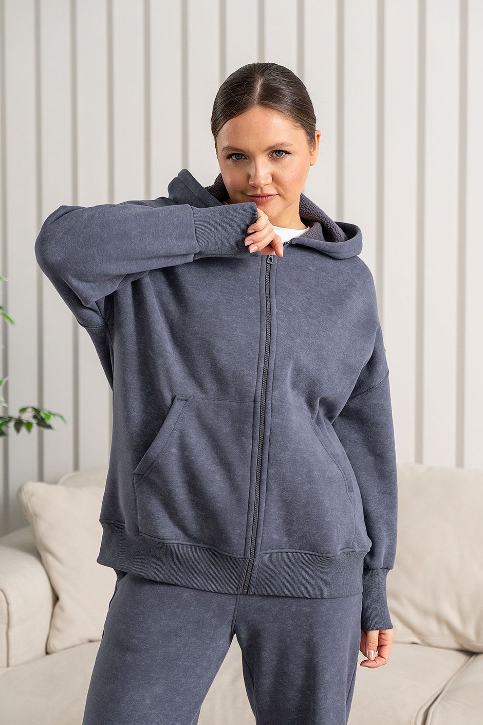 Ткань: Футер интерсофт шарпа(барашек-начес),с эффектом "варенки". Худи с капюшоном, спереди – карман-кенгуру и застежка на молнию. Длина ок 70 см.  Брюки с высокой посадкой прямого покроя, в боковых швах – косые карманы,сзади накладной карман, модная кулиска по низу брюк, длина по внутреннему шву ок.75 см.