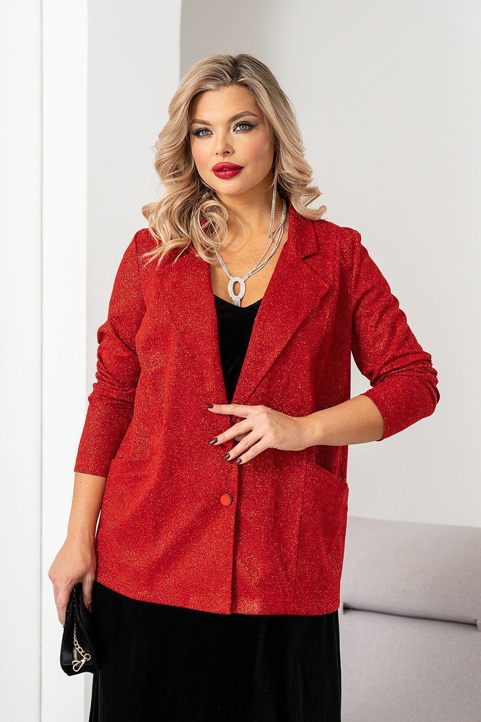 Ткань: трикотажное полотно с напылением. Жакет свободного покроя, спереди карманы, на двух пуговицах. Рукав длинный. Длина ок. 70 см.